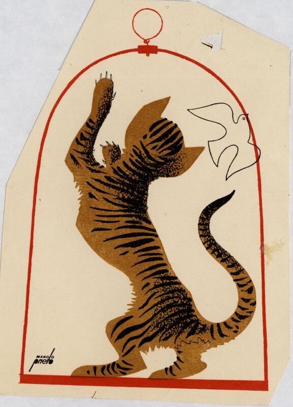 En este dibujo firmado se destaca un gato marrón con rayas negras que se encuentra de espalda intentando capturar a un pájaro blanco que consigue escapar, todo ello recogido en una jaula de color rojo.Prueba de imprenta. Ilustración realizada para la revista semanal Novelas y Cuentos. Titulo: La niña de Luzmela. Autor: Concha Espina. Nº publicado: 1176. Fecha: 22-11- 1953. Tomo NC.: 53.