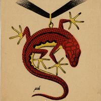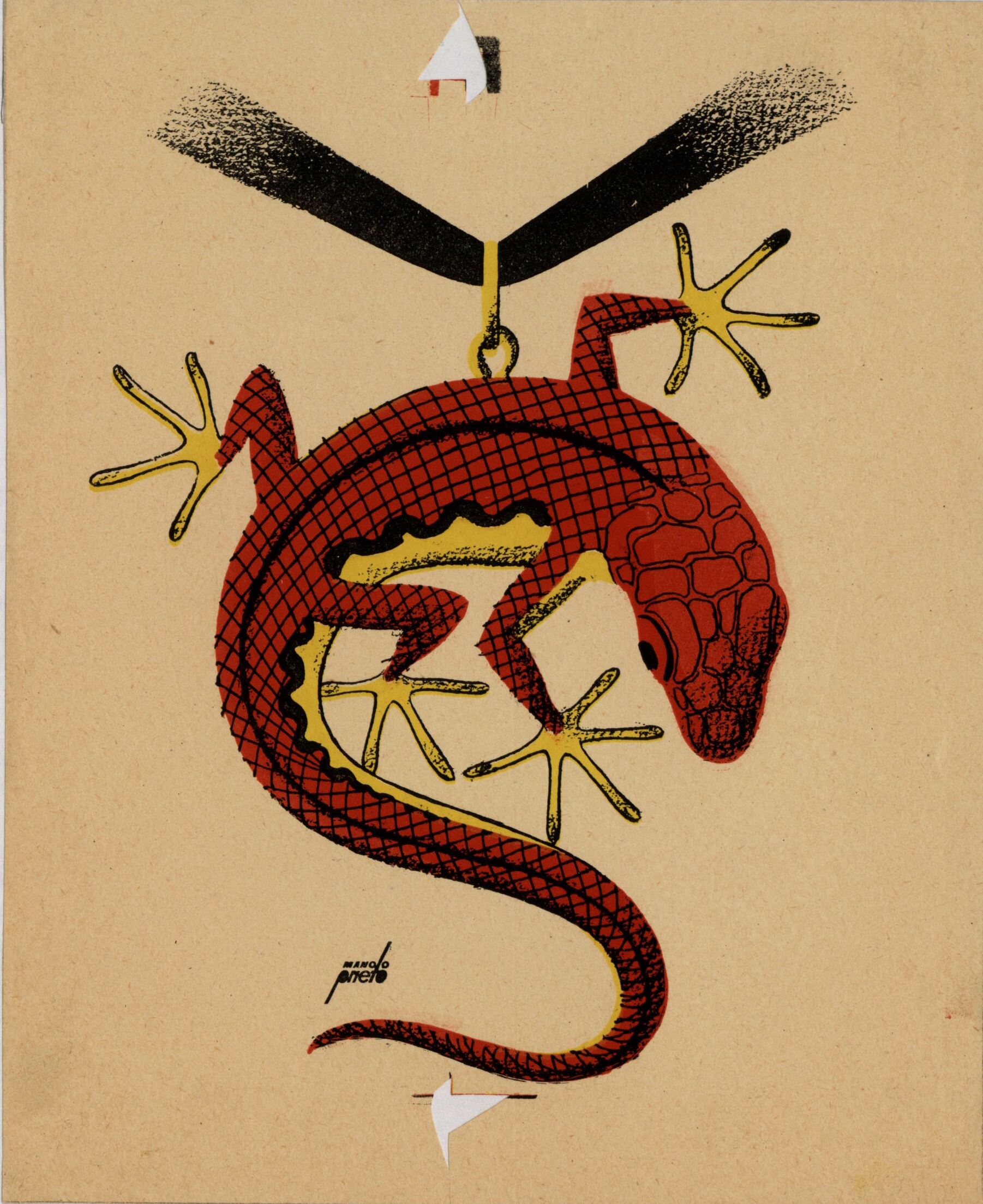 - Destaca en este dibujo firmado por el artista la imagen de una salamandra roja y amarilla sujeta por una cinta de color negro, en la parte superior de la composición.Prueba de imprenta. Ilustración realizada para la revista semanal Novelas y Cuentos. Titulo: Autor: Nº publicado: Fecha: Tomo NC.: