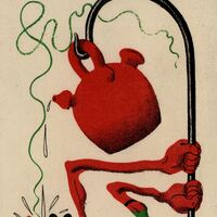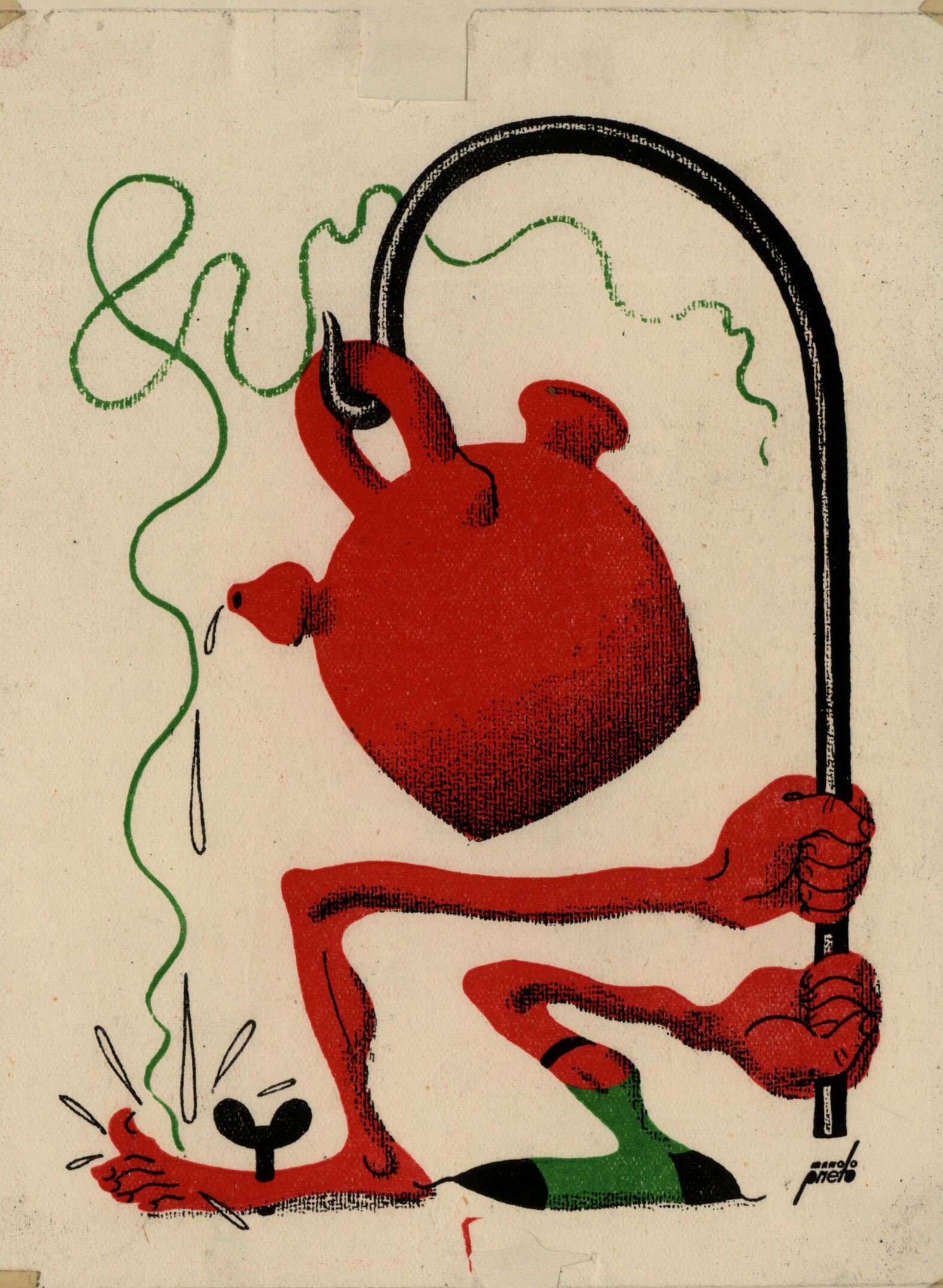 Un botijo rojo se encuentra sujeto por un gancho ligeramente inclinado deja caer algunas gotas del líquido que lleva en su interior. Dos brazos rojos, surgidos de unos Pies, uno de ellos parece que esta clavado al suelo con una palomilla, el otro con un calcetín verde, sujetan el gancho oscuro. Líneas ondulantes de color verde se sitúan alrededor de las figuras. El dibujo está firmado.Prueba de imprenta. Ilustración realizada para la revista semanal novelas y Cuentos. Titulo: Visiones de neurastenia. Autor: W. Fernández Flórez. Nº publicado: 987. Fecha: 18-06-1950. Tomo NC.: 49/ 50/. Nº de ficha duplicada 2353.