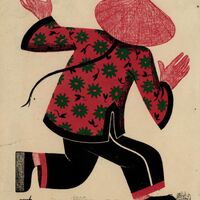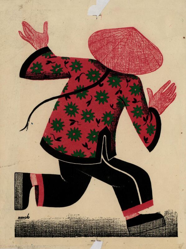 En este dibujo, en el que se puede ver la firma del pintor, destaca la imagen de un chino de espalda. Lleva pantalón negro con el ribete inferior rojo, una túnica roja decorada con flores verdes, el pelo negro y largo recogido en una trenza y un sombrero rojo claro sobre su cabeza. El personaje gesticula con sus manos.Prueba de imprenta. Ilustración realizada para la revista semanal Novelas y Cuentos. Titulo: Autor: Nº publicado: Fecha: Tomo NC.: