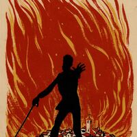 En el paisaje de un pueblo o ciudad en llamas, destacando el color rojo y amarillo, como se ve en el fondo del dibujo, se vislumbra una figura con la silueta negra gesticulando con su brazo izquierdo como si hiciera un llamamiento mientras lleva en su mano derecha una bengala. La composición está firmada por el artista.Prueba de imprenta. Ilustración realizada para la revista Novelas y Cuentos. Titulo: El mayorazgo de Labraz; Autor: Pio Baroja; Nº publicado: 1024 Fecha: 24-12-50; Tomo NC.: 25.