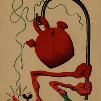 - Un cántaro rojo se encuentra sujeto por un gancho mientras ligeramente inclinado deja caer algunas gotas del líquido que lleva en su interior. Dos brazos rojos, surgidos de la tierra, sujetan el gancho oscuro. Líneas ondulantes de color verde se sitúan alrededor de las figuras. El dibujo está firmado.“Repetida con la ficha nº 132.”