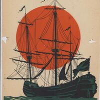 En un cielo claro se vislumbra un gran sol rojo. En primer plano una carabela negra con algunas velas desplegadas y grandes mástiles navega sobre las aguas verdes del mar. El dibujo está firmado.Prueba de imprenta. Ilustración realizada para la revista semanal Novelas y Cuentos. Titulo:Aventuras de fostrs el Marino; Autor: Capitán Marryat; Nº publicado: 795 Fecha: 04/08/46; Tomo NC.:01