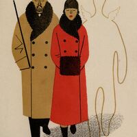 Una pareja con largos abrigos de invierno, el hombre con uno en color amarillento y la mujer con otro de color rojo, pasea acompañada por la imagen de un ángel con la silueta amarilla que se encuentra al lado de la mujer. El dibujo está firmado.Prueba de imprenta. Ilustración realizada para la revista semanal Novelas y Cuentos. Titulo: Los dos amigos. Autor; I. Turgueniev. Nº publicado: 22-07-1956. Fecha: 22- 07-1956.