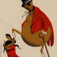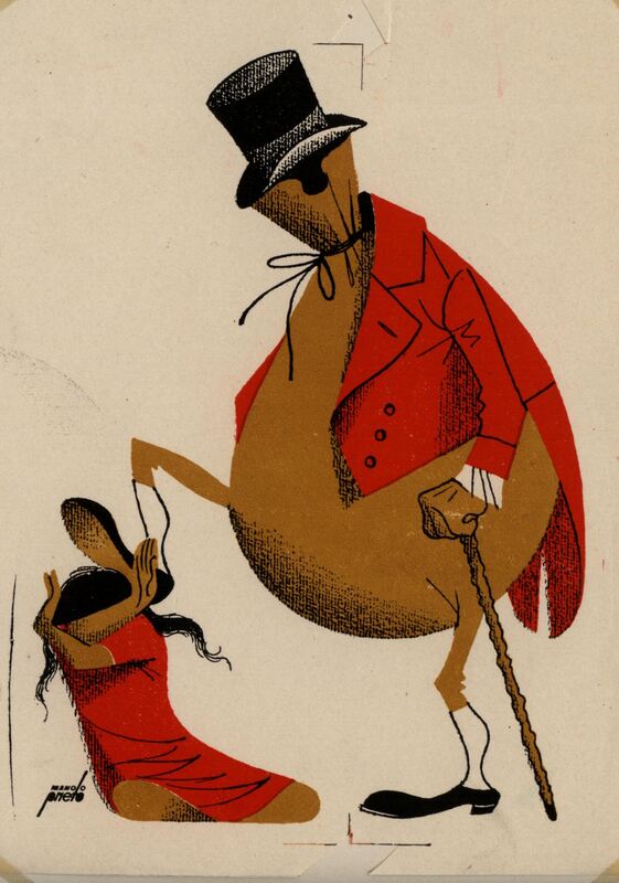 Un saco marrón al que se le ha pintado con brazos y piernas lleva una chaqueta roja, sombrero negro al igual que los zapatos y bastón marrón. Con una de sus piernas aplasta la figura sentada de una muchacha con vestido rojo que esconde su cabeza de cabellos negros entre sus brazos. En el dibujo se vislumbra la firma del pintor.Prueba de imprenta. Ilustración reali8zada para la revista semanal Novelas y Cuentos. Titulo: Autor: Nº publicado: Fecha: Tomo NC.:
