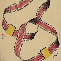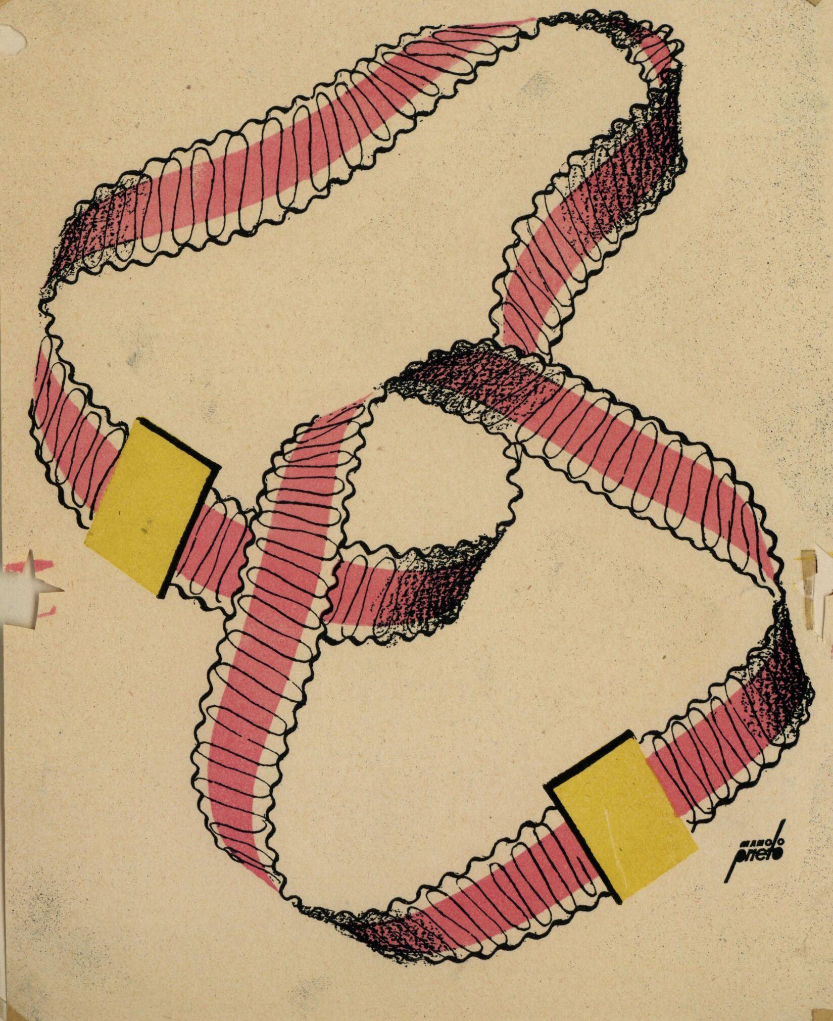 Dos cinturones o ligas, cerrados de color rosa y blanco con las hebillas amarillas se encuentran en el centro de la composición firmada por el artista.Prueba de imprenta. Ilustración realizada para la revista semanal Novelas y Cuentos. Titulo: La novia de Fontenay. Autor: Paul de Kock. Nº publicado: 1044. Fecha: 13-05- 1951. Tomo NC.: 39.