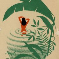 En un paisaje de verdes plantas una muchacha de pelo negro y de espalda se baña en las aguas que adquieren una tonalidad verde. En la composición se vislumbra la firma del pintor.Prueba de imprenta. Ilustración realizada para la revista semanal Novelas y Cuentos. Titulo: Un amor en los mares del sur. Autor: S. W. Powell. Nº publicado: 1072. Fecha: 25-11-1951. Tomo NC.: 60.