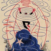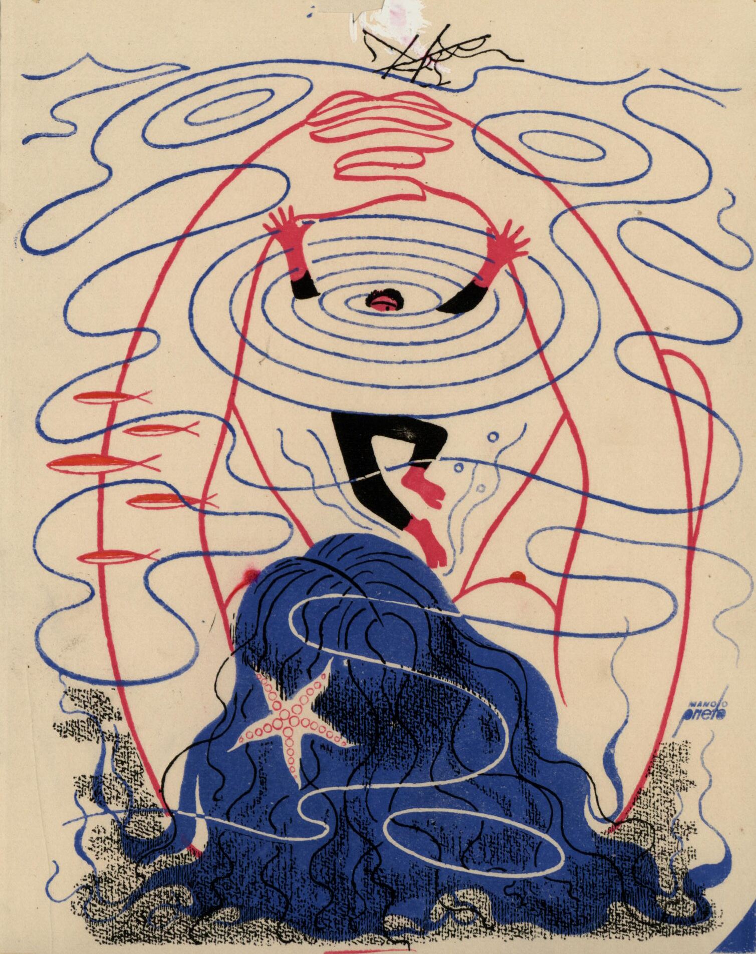 Una mujer de espalda, de la que solamente se ve su cabellera de color azul, observa como un chico con el traje negro y sus extremidades rojas, se esta ahogando envuelto en una extraña atmósfera creada por líneas azules circulares y onduladas, que representan el agua, así como también de color rojo que representan los brazos de la mujer que lo están atrayendo hacia ella.Prueba de imprenta. Ilustración realizada para la revista semanal Novelas y Cuentos. Titulo: El pescador de Islandia. Autor: Pierre de Loti. Nº publicado: 1026. Fecha: 07-01-1951. Tomo NC.: 35