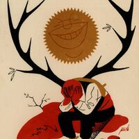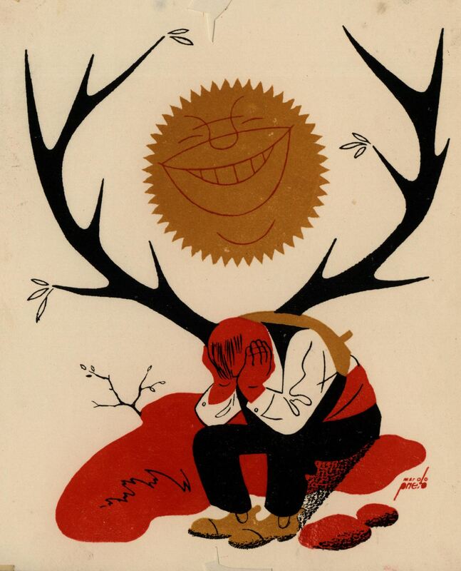 En esta imagen firmada por su autor un hombre está sentado sobre un pedrusco rojo mientras esconde su cara entre las manos. Detrás de su figura se ve un árbol con grandes ramas y sin hojas y en la parte superior un gran sol al que se le han pintado atributos humanos riendo. El traje del hombre se compone de un pantalón negro, camisa blanca, chaleco amarillo y negro y faja roja.Prueba de imprenta. Ilustración realizada para la revista semanal Novelas y Cuentos. Titulo: El curandero de su honra. Autor: Ramón Pérez de Ayala. Nº publicado: 1029. Fecha: 28-01-1951. Tomo NC.: 58.