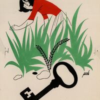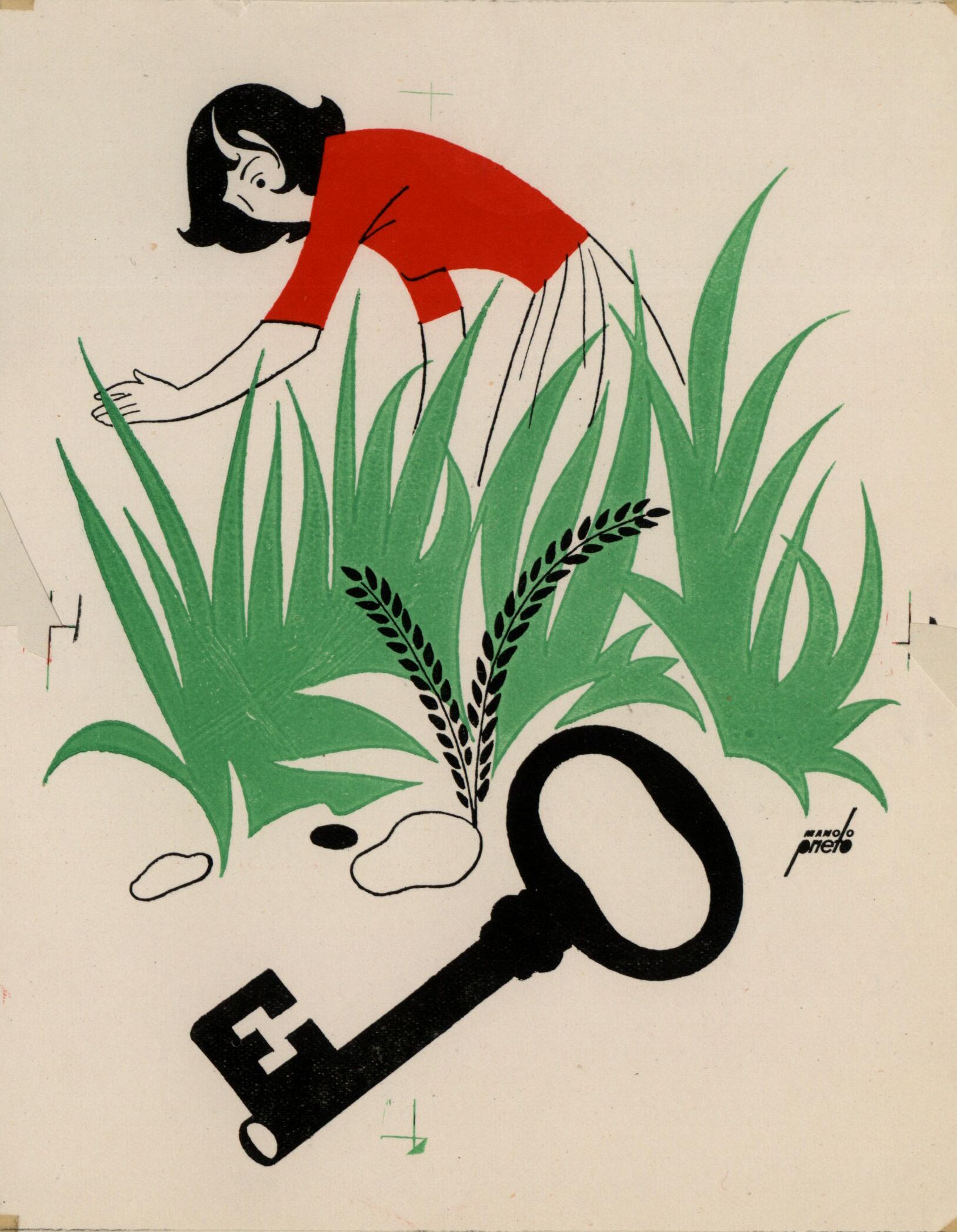 En este dibujo firmado por el pintor destaca en primer plano la imagen de una llave negra. En segundo plano una chica busca la llave perdida por entre los matorrales verdes. La joven lleva una camiseta roja y una falda blanca.Prueba de imprenta. Ilustración realizada para la revista semanal Novelas y Cuentos. Titulo: Duende amor. Autor: J. Ortiz de Pinedo. Nº publicado: 1194. Fecha: 28-03- 1954. Tomo NC.: 38