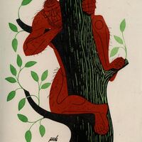 - Subido a un árbol de tronco verdoso y hojas de un verde más claro se halla un hombre mono con la piel muy oscura y con mucho pelo en su cuerpo. El dibujo está firmadoPrueba de imprenta. Ilustración realizada para la revista semanal Novelas y Cuentos. Titulo: Antes de Adan. Autor: Jack London. Nº publicado: 1126 Fecha: 07-12-52. Tomo NC: 55