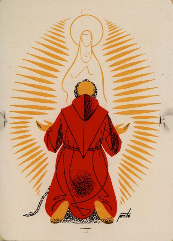 En este dibujo firmado se muestra de rodillas a un santo con el hábito rojo y los pies descalzos orando ante la imagen de la Virgen cuya silueta es amarilla y de cuya figura se desprenden rayos luminosos. La figura se encuentra de espalda.Prueba de imprenta. Ilustración realizada para la revista semanal Novelas y Cuentos. Titulo: El monje blanco. Autor: Eduardo Marquina. Nº publicado: 1192. Fecha: 14-03 1954. Tomo NC. 44
