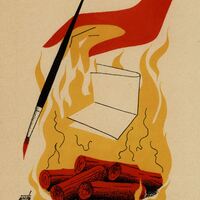 Cuatro elementos configuran este dibujo firmado: una mano que surge en la parte superior, un pincel negro, una hoja de papel en blanco y una hoguera con llamas de color amarillo.Prueba de imprenta. Ilustración realizada para la revista semanal Novelas y Cuentos. Titulo: El desquite. Autor: Matilde Aigueperse. Nº publicado: 1101. Fecha: 15-06- 1952. Tomo NC. 55.