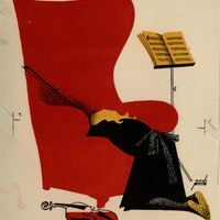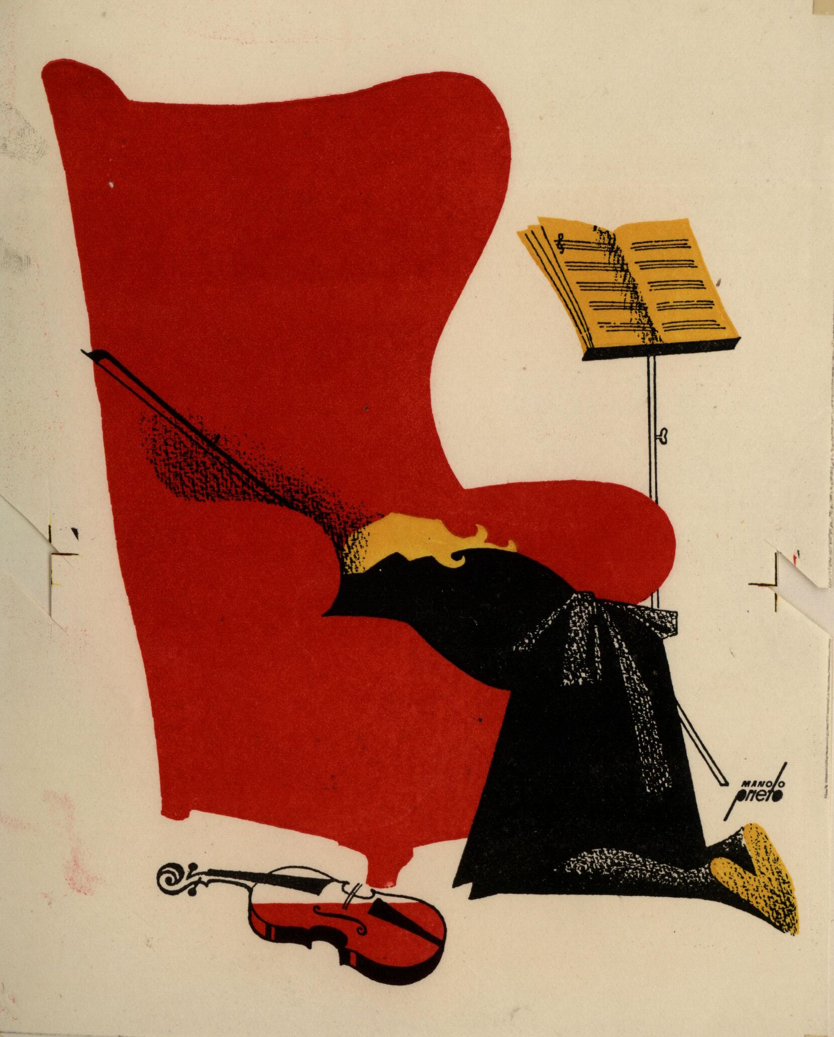 Una mujer con un vestido negro y con el pelo rubio está en una posición agachada escondiendo su cara en un sofá rojo en una actitud desesperada. En el suelo, a su lado derecho, destaca un violín, y en el lado izquierdo del sofá un atril con unas partituras de color amarillo. El dibujo está firmado.Prueba de imprenta. Ilustración realizada para la revista semanal Novelas y Cuentos. Titulo: Tres caras de un alma. Autor: Lucia Delarve Mardurs. Nº publicado: 1038. Fecha: 01-04-1951. Tomo NC. 45.