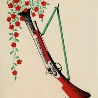 En el dibujo firmado destaca una escopeta colgada con una cinta verde y en una posición vertical. De su cañón de tiro surge un ramillete de unas flores rojas con hojas verdes.Prueba de imprenta. Ilustración realizada para la revista semanal Novelas y Cuentos. Titulo: El hijo de un ladrón. Autor: Jules Mary. Nº publicado: 1163. Fecha: 23-08-1953. Tomo NC. 35.