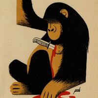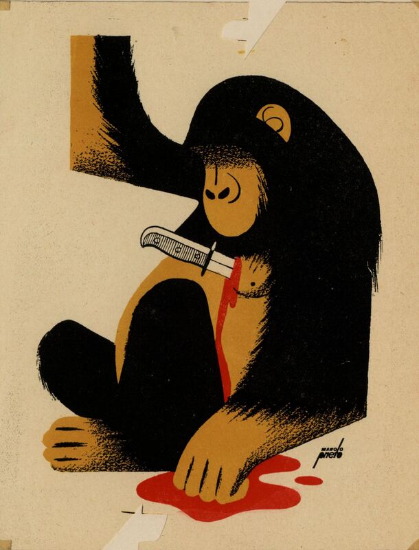 En el centro de esta composición se ha dibujado a un mono sentado de color negro y marrón al que se le ha clavado un puñal en el pecho. De su herida brota la sangre. En el dibujo está presente la firma del pintor.Prueba de imprenta. Ilustración realizada para la revista semanal Novelas y Cuentos. Titulo: Asesino de monos. Autor: Elizabeth Ferrars. Nº publicado:1075. Fecha: 16- 12-1951. Tomo NC. 36.