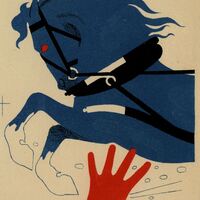 Dos elementos configuran este dibujo firmado: un caballo que se muestra de perfil de color azul y levantando sus patas delanteras hacia arriba y una mano roja, en la parte inferior, intentando detener al caballo.Prueba de imprenta. Ilustración realizada para la revista semanal Novelas y Cuentos. Titulo: Autor: Nº publicado: Fecha: Tomo NC.