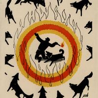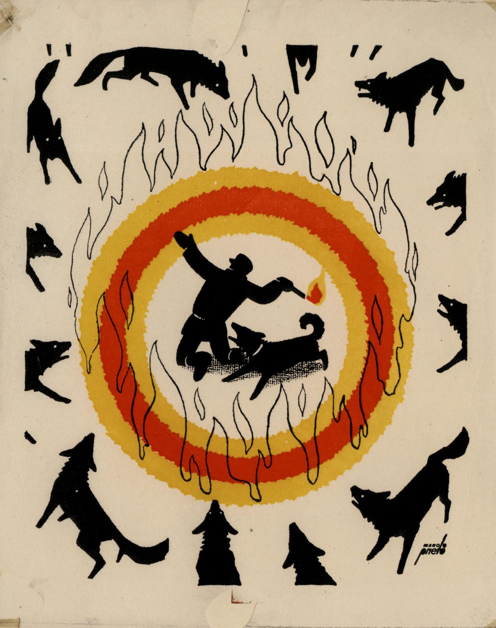 En el interior de un circulo de fuego están un hombre y un perro intentando librarse de una multitud de lobos que se encuentran rodeando las llamas del fuego. Predominan en el dibujo firmado los colores negro, rojo y amarillo.Prueba de imprenta. Ilustración realizada para la revista semanal Novelas y Cuentos. Titulo: Colmillo Blanco. Autor: Jack London. Nº publicado: 982. Fecha: 05-03.1950. Tomo NC. 52.