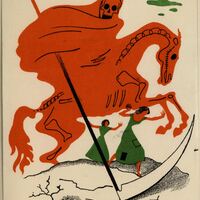 En este dibujo firmado aparecen dos muchachas con sus vestidos verdes y pelos negros corriendo ante la persecución de la muerte representada en este caso sobre un caballo llevando su guadaña y toda la figura de color rojo.Prueba de imprenta. Ilustración realizada para la revista semanal Novelas y Cuentos. Titulo: Autor: Nº publicado: Fecha: Tomo NC.