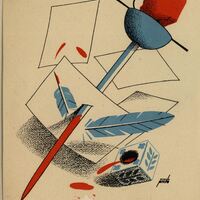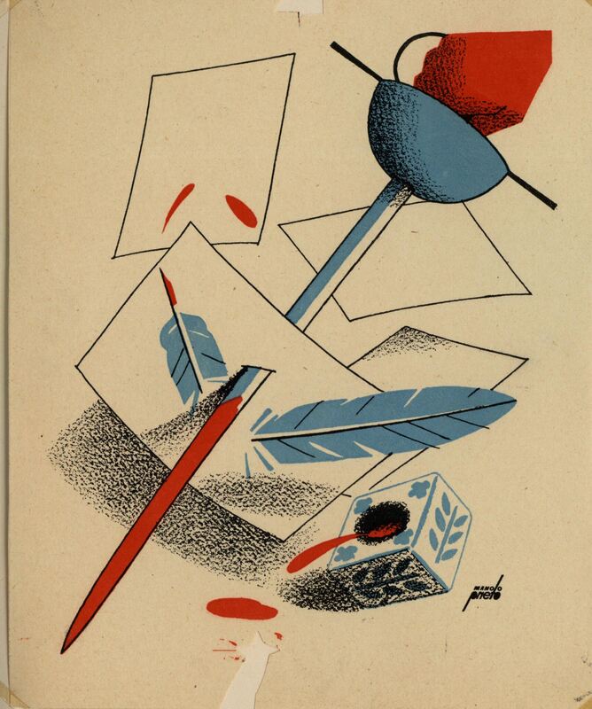 Cuatro elementos configuran este dibujo firmado: una espada azul con su punta ensangrentada traspasa una hoja de papel en blanco. Además se ven una pluma azul rota y un tintero.Prueba de imprenta. Ilustración realizada para la revista semanal Novelas y Cuentos. Titulo: Vida por honra. Autor: J. E. Hartzenbusch. Nº publicado: 1102. Fecha: 22-06- 1952. Tomo NC. 42.