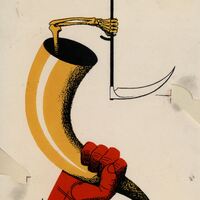 En esta composición en la que esta presente la firma del pintor se halla un cuerno amarillo cogido por una mano roja. De su interior sale un brazo esquelético sosteniendo la guadaña de la muerte.Prueba de imprenta. Ilustración realizada para la revista semanal Novelas y Cuentos. Titulo: Hernani. Autor: Víctor Hugo. Nº publicado: 1134. Fecha: 01-02-1951. Tomo NC. 58.