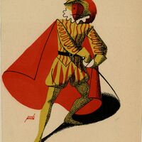 De frente y de pie se encuentra en este dibujo un espadachín pronto a coger su espada. Su traje es amarillo con rayas muy finas de color rojo en el que destaca una gran capa roja. Sobre su cabeza lleva un sombrero amarillo con una pluma roja. En el dibujo se vislumbra la firma del pintor.Prueba de imprenta. Ilustración realizada para la revista semanal Novelas y Cuentos. Ttiulo: Don Juan. Autor: Próspero Merimée. Nº publicado: 1052. Fechas: 08-07-1951. Tomo NC. 46.