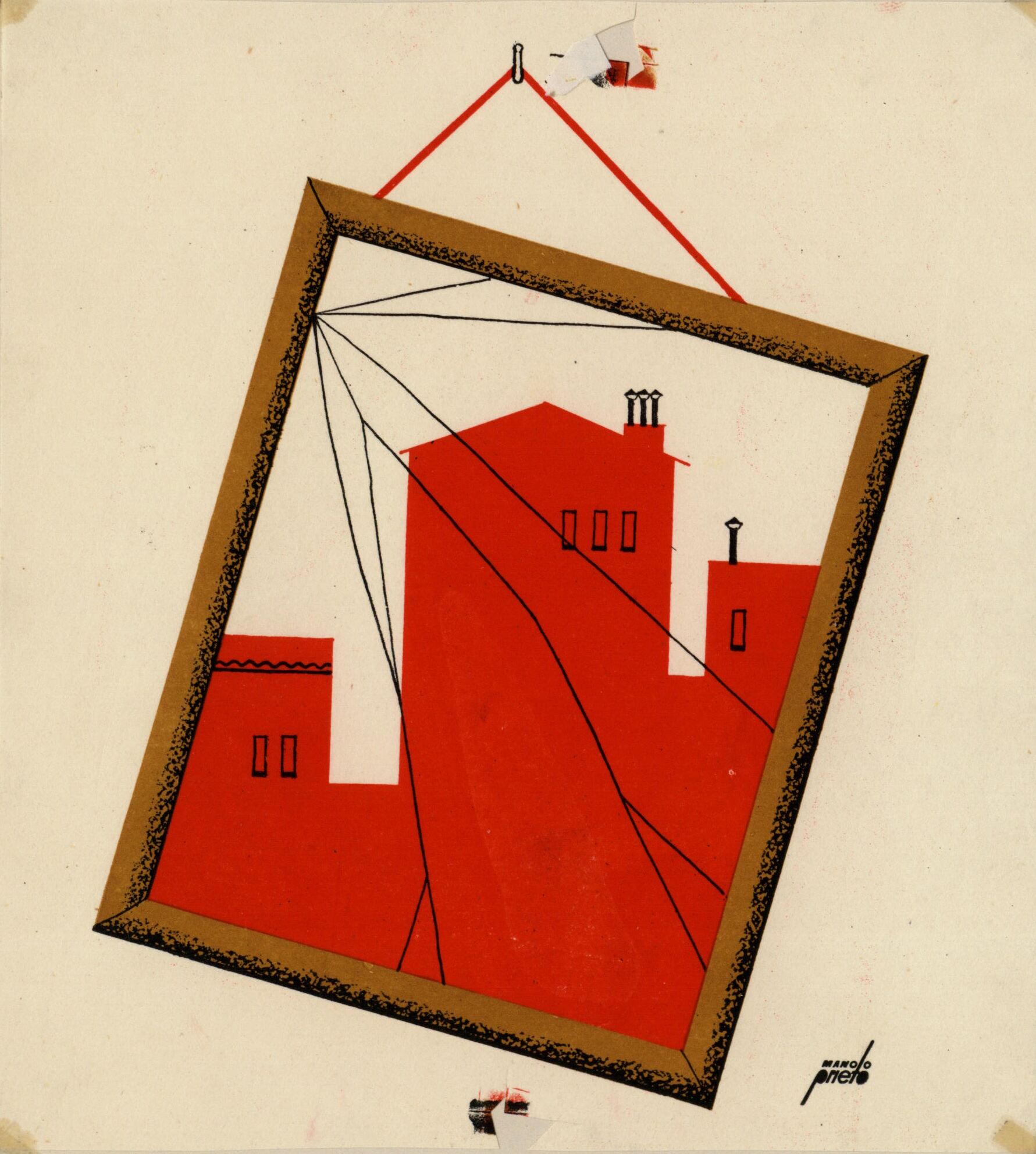 Sobre una pared se encuentra un cuadro torcido y con su cristal roto. En su lienzo tiene dibujados algunos edificios rojos con ventanas negras. El marco del cuadro es marrón. En el dibujo se halla la firma del artista.Prueba de imprenta. Ilustración realizada para la revista semanal Novelas y Cuentos. Titulo: El frágil espejo. Autor: Norat Lofts. Nº publicado: 1271. Fecha: 18-09-1955. Tomo NC. 37.