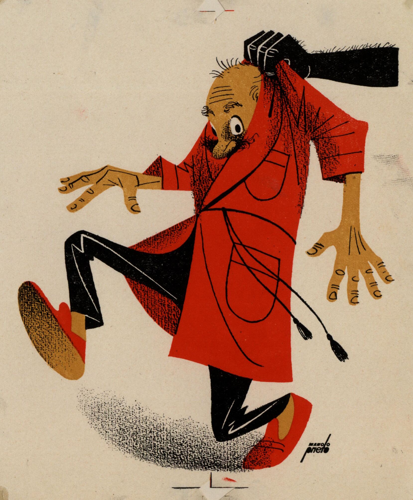 Un hombre con el pijama negro y una bata roja es cogido en su espalda al que le agarra la bata una mano que surge del lado izquierdo del dibujo firmado. La mano es de color negro.Prueba de imprenta. Ilustración realizada para la revista semanal Novelas y Cuentos. Titulo: Los buscadores de tesoros. Autor: W. Irving. Nº publicado: 1329. Fecha: 28-10 -1956. Tomo NC. 32.