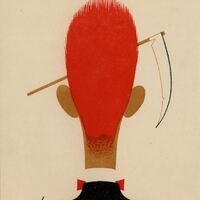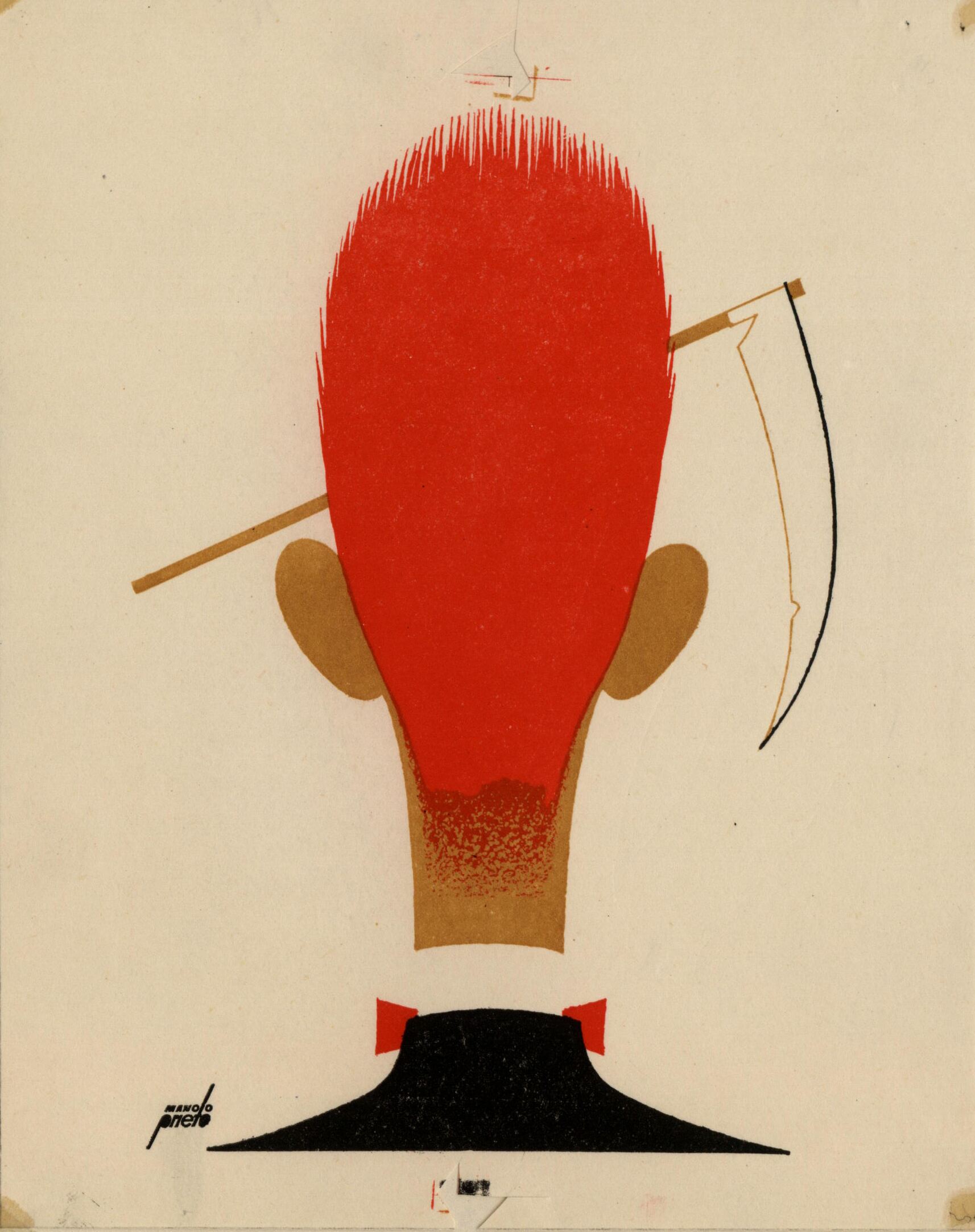 En este dibujo firmado destaca la figura de un hombre de espalda con una cabeza muy larga y con el pelo rojo. El personaje, que lleva un traje oscuro, camisa blanca y pajarita roja, parece observar una guadaña, como aparece en segundo término. La firma del pintor se puede vislumbrar en el dibujo.Prueba de imprenta. Ilustración realizada para la revista semanal Novelas y Cuentos. Titulo: La litera fantástica. Autor: Rudyard kipling. Nº publicado: 1292. Fecha: 12-12- 1956. Tomo NC. 32.