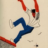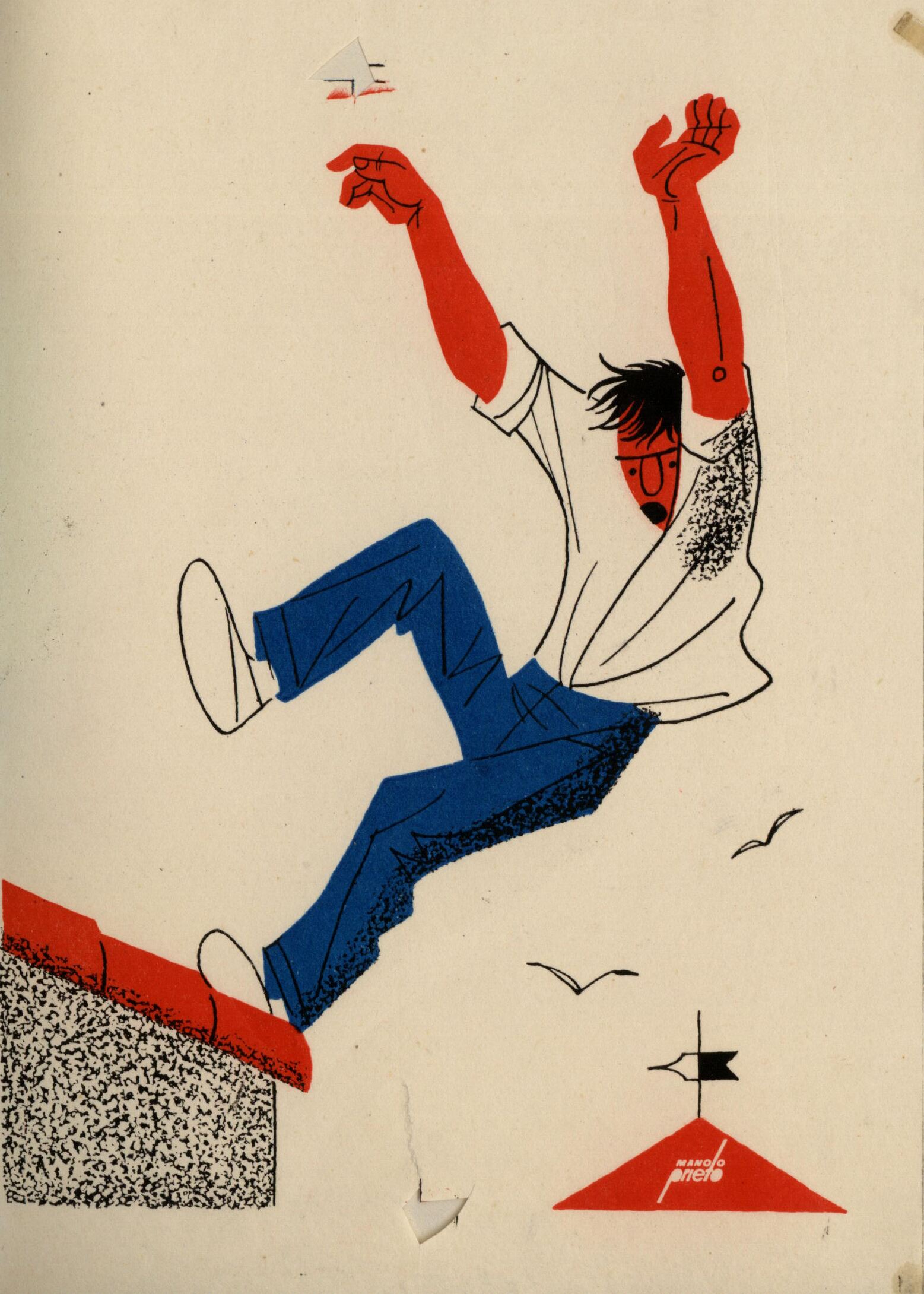 Un hombre con camisa blanca y pantalón azul se desequilibra y cae al suelo desde un tejado. Se puede ver como el hombre abre su boca asustado y levanta las manos hacia arriba. En la composición puede apreciarse la firma del artista.Prueba de imprenta. Ilustración realizada para la revista semanal Novelas y Cuentos. Titulo: Enterrado por gusto. Autor: Edmund Crispin. Nº publicado: 1307. Fecha: 27- 05-1956. Tomo NC. 31.