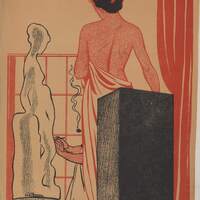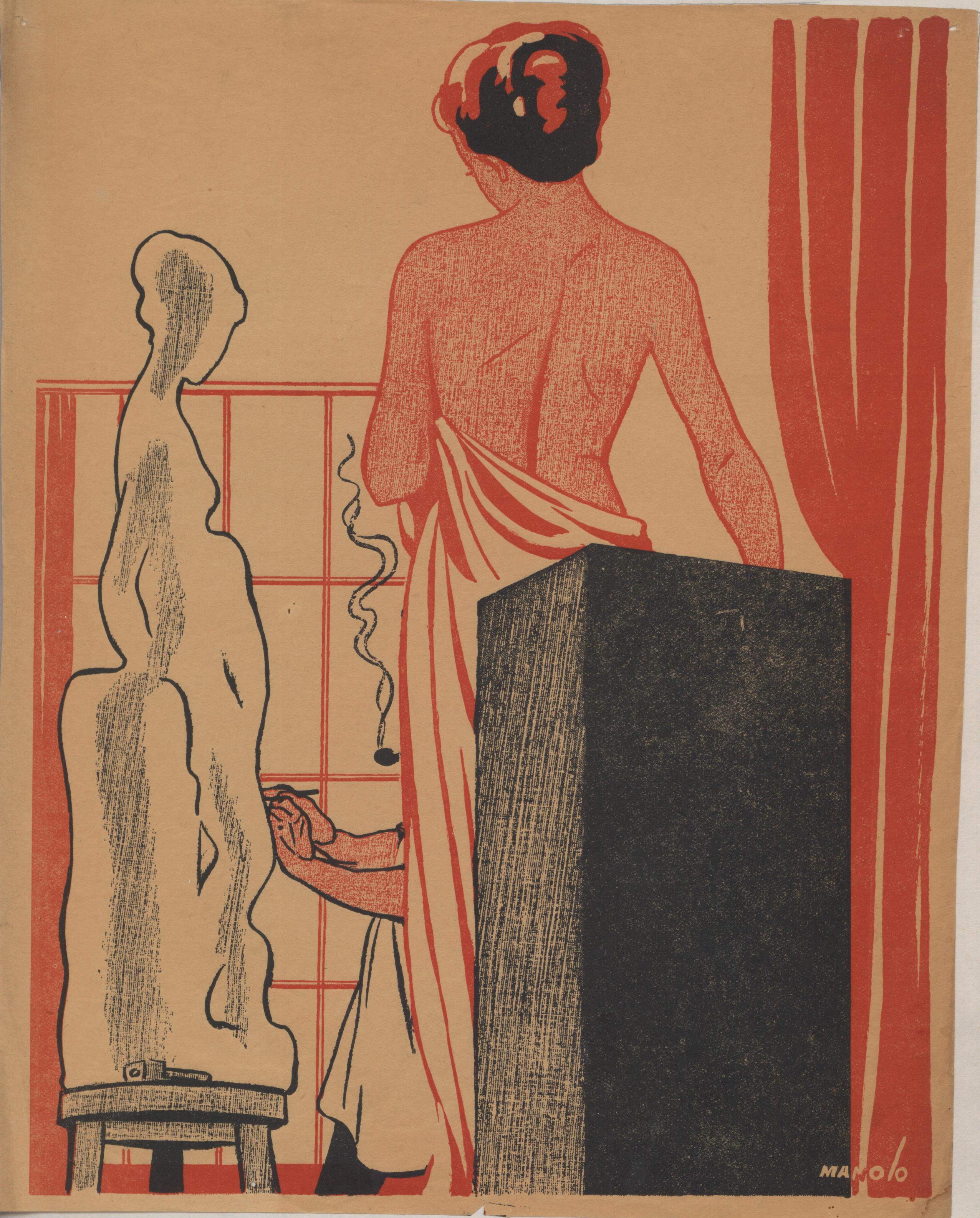En este dibujo firmado se ha representado el interior del estudio de un artista en el que aparece, en primer término, una mujer desnuda sosteniendo una túnica, de espalda y con el cabello negro recogido. En un segundo plano se vislumbran las manos del artista realizando una escultura. Destacan en el dibujo los colores blanco, negro y rojo.Prueba de imprenta. Ilustración realizada para la revista semanal Novelas y Cuentos. Titulo: Autor: Nº publicado: Fecha: Tomo NC.: