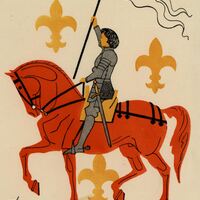 En un fondo claro en el que se vislumbran tres flores de lis de color amarillo aparece de perfil sobre un caballo rojizo la santa guerrera de nacionalidad francesa con su armadura de color gris portando un estandarte blanco. En la composición está presente la firma del pintor.Prueba de Imprenta. Ilustración realizada para la revista semanal Novelas y Cuentos. Titulo: Autor: Nº publicado: Fecha: Tomo NC.