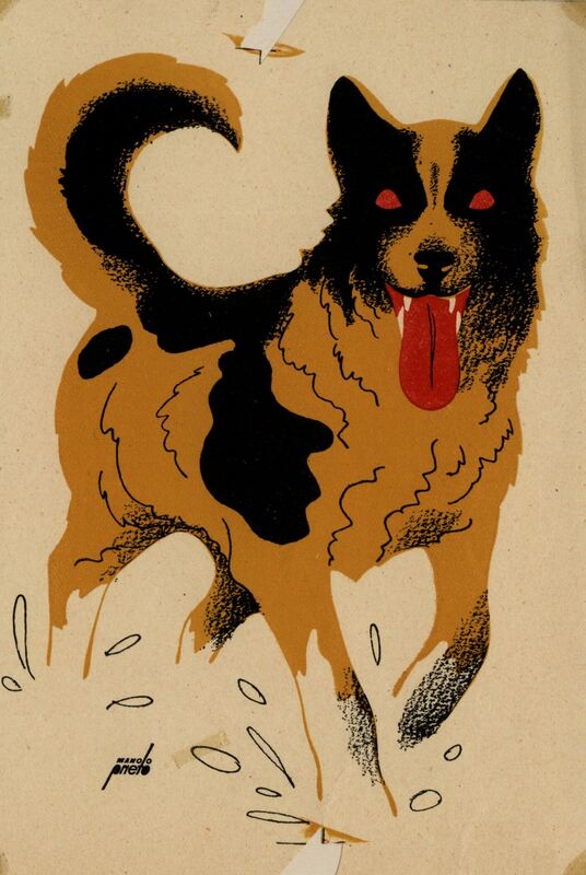 La figura central de esta composición firmada es un perro marrón con manchas negras por su cuerpo. El animal aparece de frente, tiene los ojos rojos y lleva la lengua roja fuera de su boca.Prueba de imprenta. Ilustración realizada para la revista semanal Novelas y Cuentos. Titulo: La llamada de la selva. Autor: Jack London. Nº publicado: 1060. Fecha: 02-09-1951. Tomo NC. 60