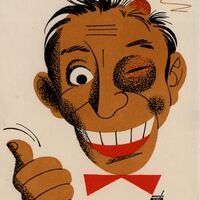 En este dibujo firmado solamente se ve la cabeza de un hombre que sonríe dejándose ver sus dientes muy blancos mientras hace un gesto con la mano de buena suerte. Lleva una pajarita roja y tiene heridos su ojo izquierdo y la cabeza en la que sobresale un chichón.Prueba de imprenta. Ilustración realizada para la revista semanal Novelas y Cuentos. Titulo Blanca por fuera Rosa por dentro. Autor: E. Jardiel Poncela. Nº publicado: 1211. Fecha: 25-07-1955. Tomo NC. 53.