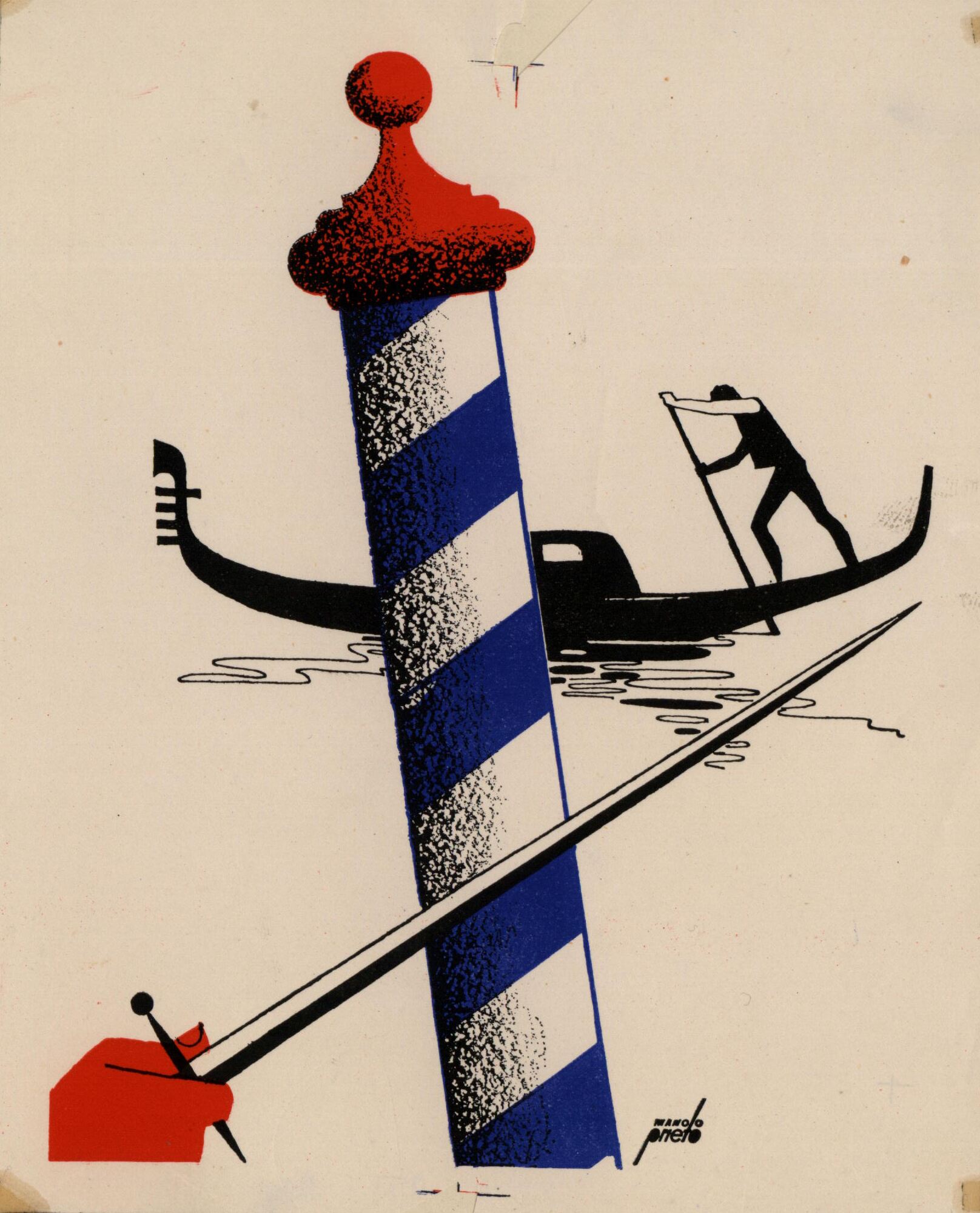 En primer plano se vislumbran una mano que sostiene una espada y una columna decorada con líneas blancas y azules con el tejadillo rojo. En segundo plano se ve la figura en negro de un gondolero conduciendo su barco. En el dibujo está presente la firma del pintor.Prueba de imprenta. Ilustración relizada para la revista semanal Novelas y Cuentos. Titulo: El Bravo. Autor: Fenimore Cooper. Nº publicado: 1219. Fecha: 19-09-1954. Tomo NC. 59.