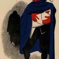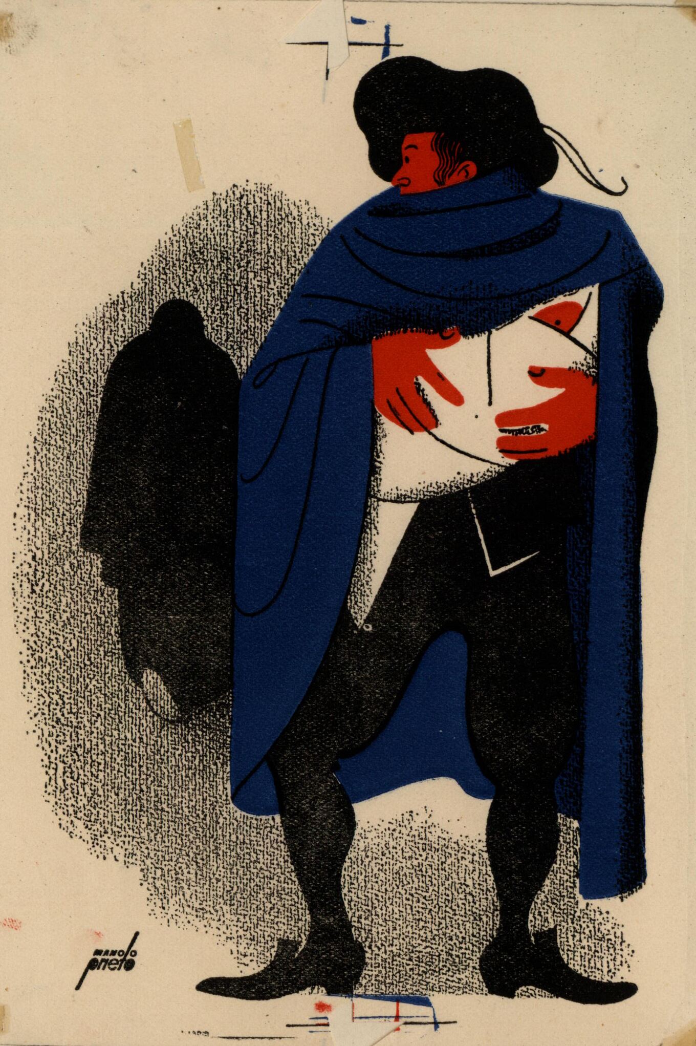 En primer término un hombre con el traje negro así como su sombrero y envuelto en una capa azul sostiene en sus brazos a un bebé envuelto a su vez en una tela blanca mientras gira su cabeza hacia atrás. En segundo plano se vislumbra una segunda figura de color negro, parece una mujer que se aleja, vestida toda de negro. En el dibujo se puede observar la firma del pintor.Prueba de imprenta. Ilustración realizada para la revista semanal Novelas y Cuentos. Titulo: El sacristán de las monjas. Autor: Pedro Escanilla. Nº publicado: 1021. Fecha: 03-12-1950. Tomo NC. 52.