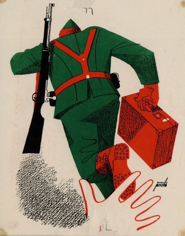 Un hombre al que se ve de espalda con un traje verde corre llevando sobre su hombro una escopeta mientras que en una de sus manos sostiene un maletín rojo. Una mano con la silueta roja aparece en primer término.Prueba de imprenta. Ilustración realizada para la revista semanal Novelas y Cuentos. Titulo: Los pendientes de la muerta. Autor: P. Wentworth. Nº publicado: 1124. Fecha: 25-11-1952. Tomo NC. 35.