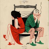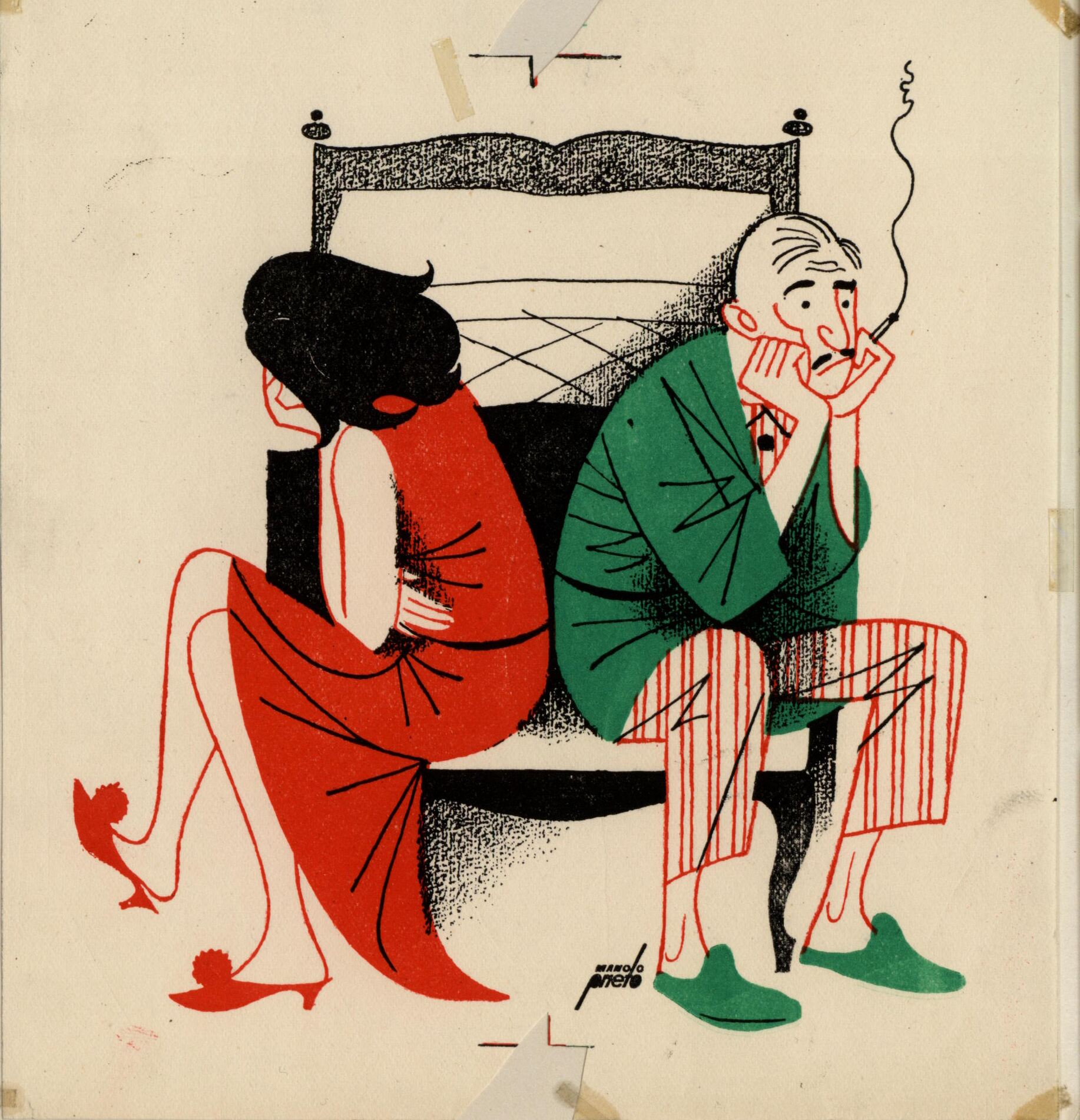 Sobre una cama están sentados un hombre y una mujer dándose la espalda. La mujer lleva un vestido rojo y zapatos también rojos y el pelo negro suelto. El hombre, que sostiene un cigarro en su mano, viste un pijama blanco con rayas rojas y una bata verde del mismo color que las zapatillas. El rostro de la mujer no se muestra mientras que el del hombre está a la vista demostrando una actitud de aburrimiento. El dibujo está firmado.Prueba de imprenta. Ilustración realizada para la revista semanal Novelas y Cuentos. Titulo: Una noche de primavera sin sueño. Autor: E. Jardiel Poncela. Nº publicado: 1336. Fecha: 16-12-1956. Tomo NC. 51.