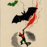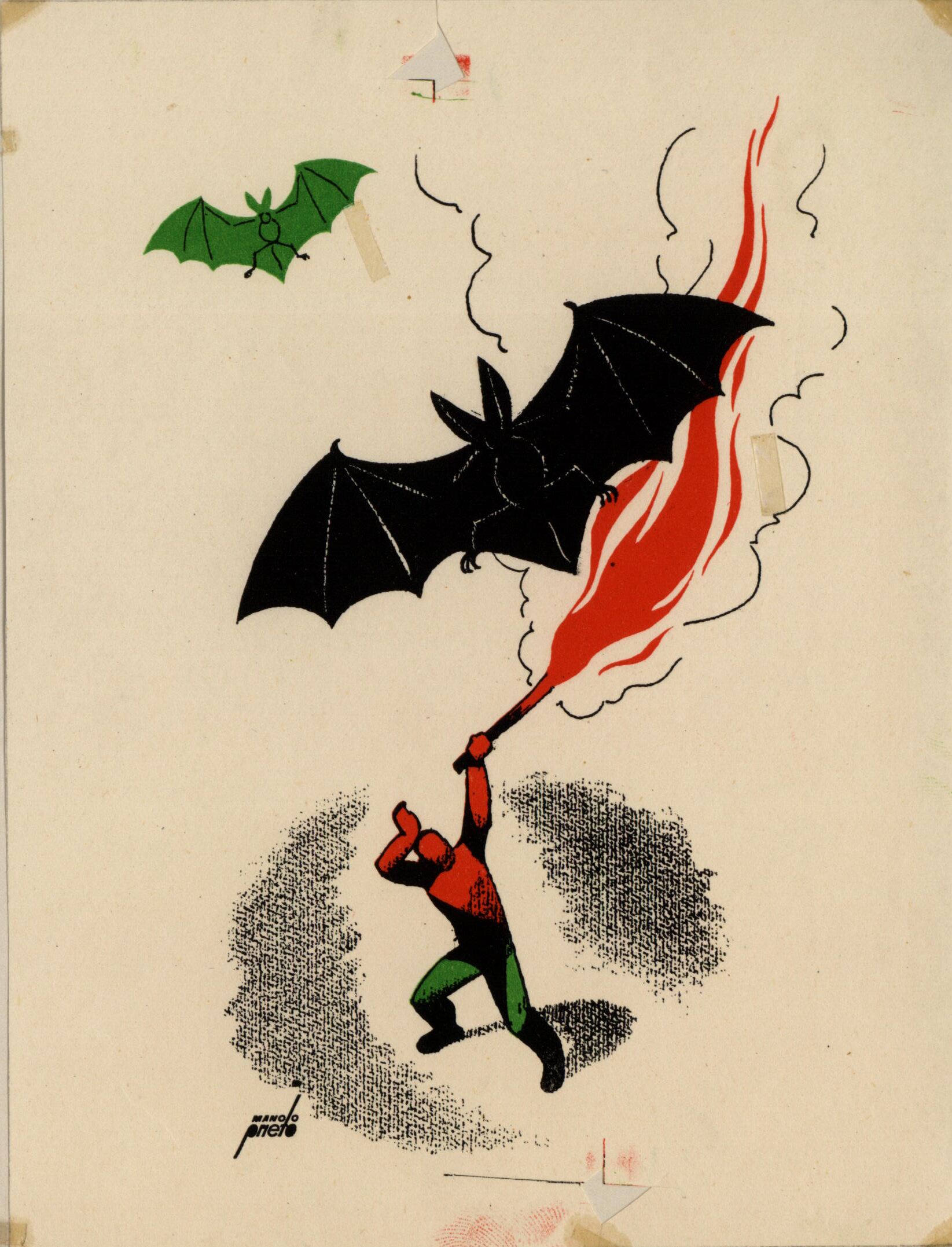 Un hombre intenta asustar con un palo encendido, del que se desprende una llama roja, a unos murciélagos que vuelan por los aires. Uno de ellos es negro y el otro es verde. En el dibujo está presente la firma del pintor.Prueba de imprenta. Ilustración realizada para la revista semanal de ovelas y Cuentos. Titulo: Autor: Nº publicado: Fecha: Tomo NC.