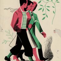 Se han representado a tres personas en este dibujo firmado: dos hombres y en medio una mujer. Los tres van caminando mientras hablan. El primer hombre lleva un pantalón negro y una chaqueta marrón, la chica lleva una falda blanca y una camiseta marrón y el tercero lleva un traje verde con unas botas altas de color negro. Las tres figuras están de perfil. A su alrededor hay algunas plantas de hojas verdes.Prueba de i8mprenta. Ilustración realizada para la revista semanal Novelas y Cuentos. Titulo: Autor: Nº publicado: Fecha: Tomo NC.