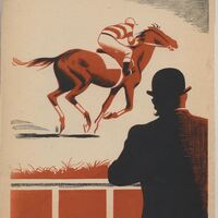 - Apoyado sobre una barandilla roja y blanca aparece la imagen de un hombre de espalda con el traje y sombrero oscuros observando como corre un jinete sobre su caballo marrón. El dibujo está firmado.Prueba de imprenta. Ilustración realizada para la revista semanal Novelas y Cuentos. Titulo: Autor: Nº publicado: Fecha: Tomo NC.: