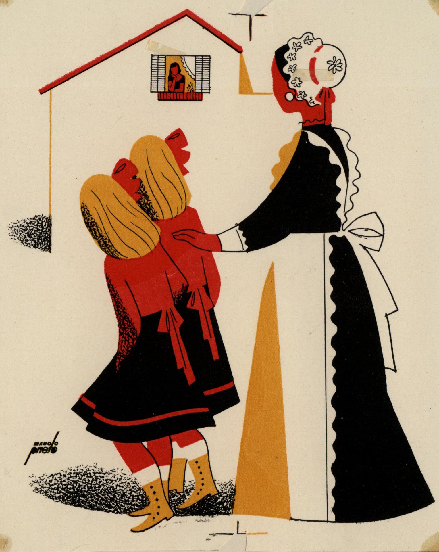 Dos niñas rubias con el traje rojo y negro son conducidas por la niñera que lleva el uniforme blanco y negro. Las tres figuras están de perfil y parecen observar una figura que surge en la ventana de una casa blanca. La composición está firmada.Prueeba de imprenta. Ilustración realizada para la revista semanal Novelas y Cuentos. Titulo: El triunfo de la huída. Autor: D. E. Stevenson. Nº publicado: 1159. Fecha: 26- 07-1953. Tomo NC. 55.