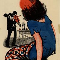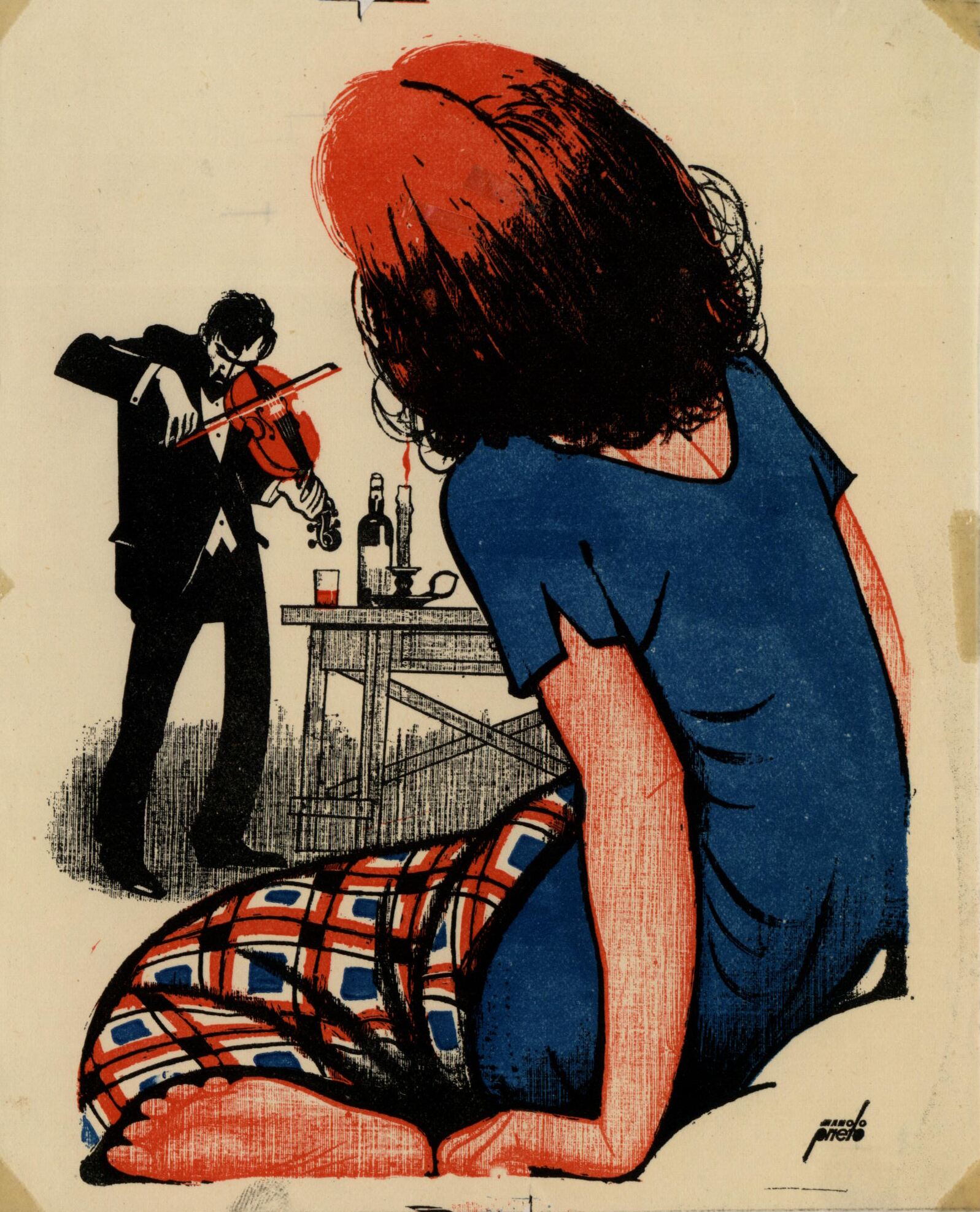 Una mujer de espalda con el pelo rojizo, una camiseta azul y una falda con dibujos parece observar como un hombre, que aparece en segundo plano, toca el violín. Al lado del hombre hay una botella, un vaso y un candelabro con una vela encendida. El dibujo está firmado.Prueba de imprenta. Ilustración realizada para la revista semanal Novelas y Cuentos. Titulo: Nietotchka Nezvanova; Autor: Hedor Dostoiesky; Nº publicado: 996; Fecha: 11-06-50; Tomo NC. 39.