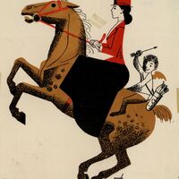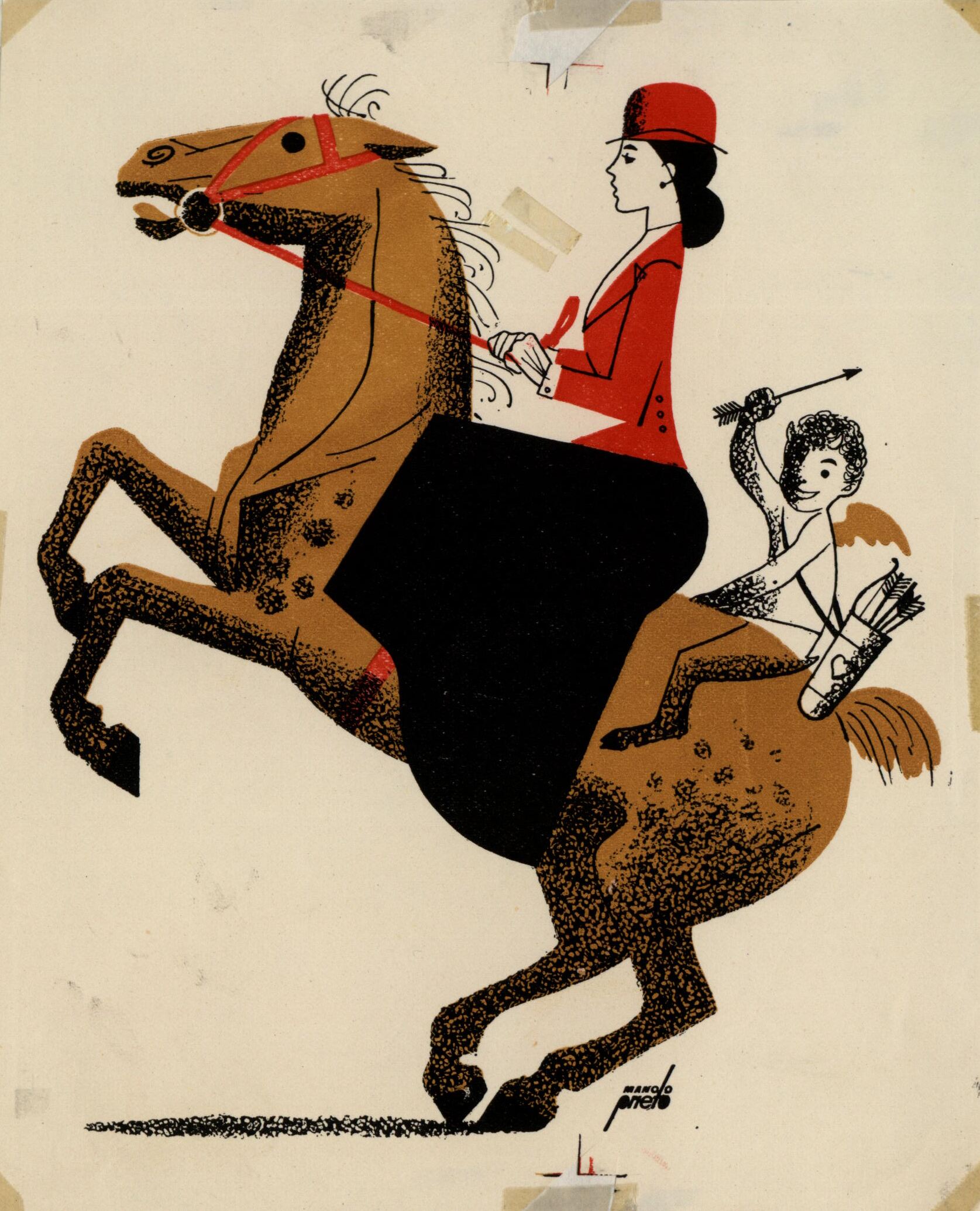 En este dibujo firmado se muestra un caballo marrón con manchas negras levantando sus patas delanteras. Sobre su lomo está sentada una mujer con falda negra, chaqueta roja al igual que el sombrero rojo que lleva sobre su cabeza. Detrás de su figura se ve un ángel pequeño con alas. Las figuras se hallan de perfil.Prueba de imprenta. Ilustración realizada para la revista semanal Novelas y Cuentos. Titulo: Autor: Nº publicado: Fecha: Tomo NC.