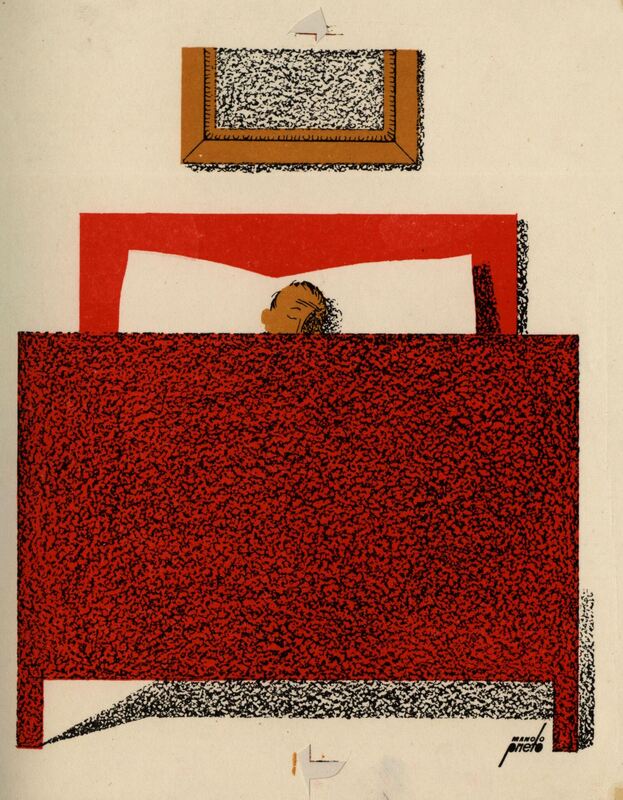 En esta composición se ha representado a un hombre durmiendo metido entre sábanas blancas en una cama de color rojo. Sobre la cama se ve el detalle de un cuadro. El pintor ha dejado su huella presente en la firma.Prueba de imprenta. Ilustración realizada para la revista semanal Novelas y cuentos. Titulo: El enfermo. Autor: Azorín. Nº publicado: 1264. Fecha: 31-07-1955. Tomo NC. 44.