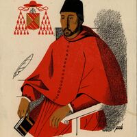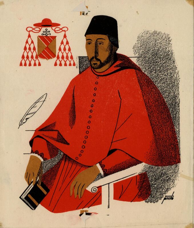 Sentado en una silla se ha representado en este retrato a un alto dignatario de la iglesia. Lleva una larga túnica de color rojo y un sombrero negro en su cabeza. En una de sus manos agarra un libro de tapas negras con el cierre en dorado. Su piel es morena y en su rostro crece una barba oscura. En la parte superior destaca el escudo eclesial de dicho personaje. A la izquierda se vislumbra la firma del pintor.Prueba de imprenta. Ilustración realizada para la revista semanal Novelas y Cuentos. Titulo: Autor: Nº publicado: Fecha: Tomo NC.