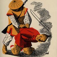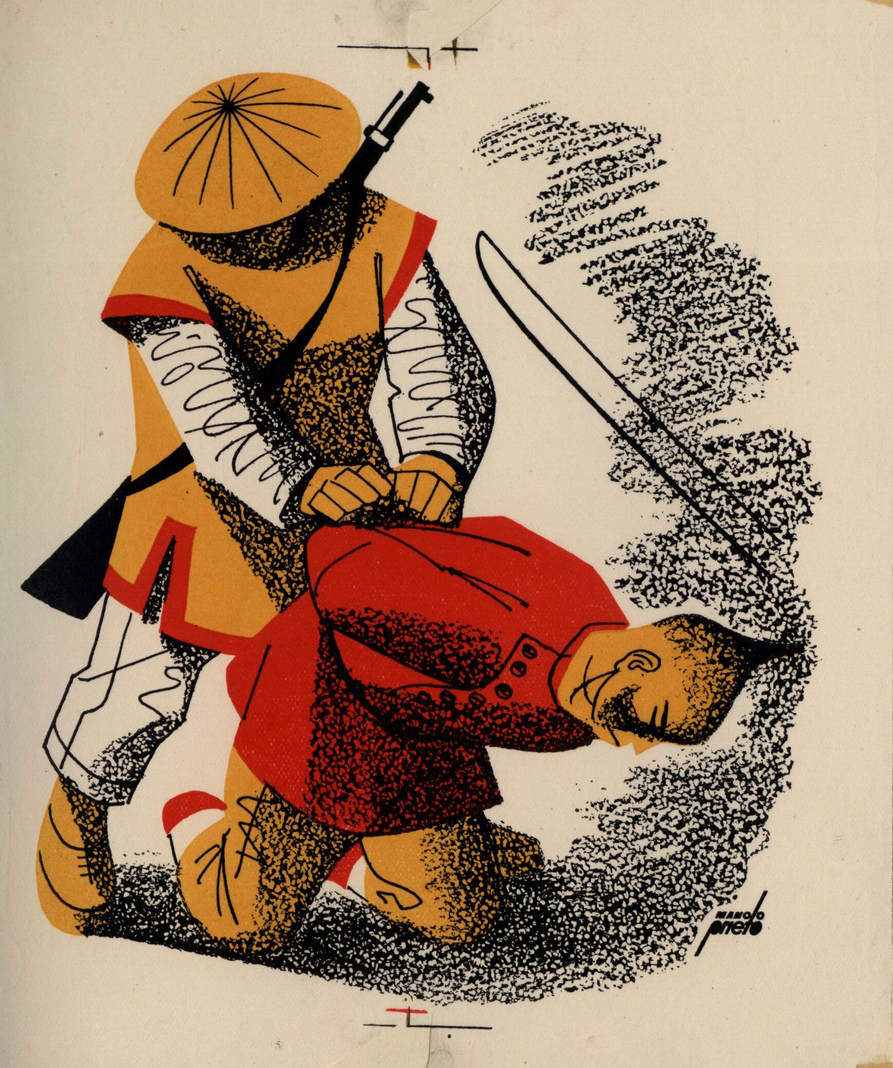 Dos hombres configuran esta escena en la que está presente la firma del pintor: uno de pie ata las manos a otro hombre que está de rodillas. El hombre que está de pie lleva pantalón blanco y por encima una túnica amarilla y el que está de rodillas un pantalón amarillo y una túnica roja. El primero lleva sombrero y una escopeta en la espalda mientras que el segundo no lleva ninguno de estos elementos. A un lado aparece la hoja de una espada, como si se tratase de una ejecución.Prueba de imprenta. Ilustración realizada para la revista semanal Novelas y Cuentos. Titulo: El dragón rojo. Autor: Lewis Stanton Falen. Nº publicado: 1191. Fecha: 07-03- 1954. Tomo NC. 41.