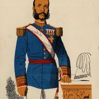 En este retrato se ha representado la figura de Alfonso XIII de pie. En él destacan unos pantalones blancos y una chaqueta azul con adornos dorados y una banda blanca sobre su pecho como también se ven algunas condecoraciones. En su rostro crece barba oscura. Su mano izquierda la apoya sobre una mesa en la que también puede verse un gorro con penacho blanco. La firma del pintor puede vislumbrarse en la composición.Prueba de imprenta. Ilustración realizada para la revista semanal Novelas y Cuentos. Titulo: Autor: Nº publicado: Fecha: Tomo NC.