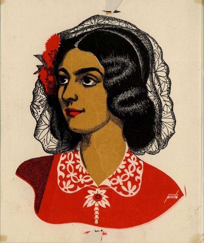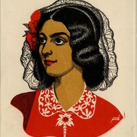 Una mujer con una mantilla sobre su pelo negro, en el que hay también una flor roja, sonríe en este retrato firmado. Su rostro mira hacia el lado derecho y destaca su vestido rojo con la gola blanca. Su piel es muy morena, sus labios son rojos y sus ojos negros son vivaces.Prueba de imprenta. Ilustración realizada para la revista semanal de Novelas y Cuentos. Titulo: Autor: Nº publicado: Fecha: Tomo NC.