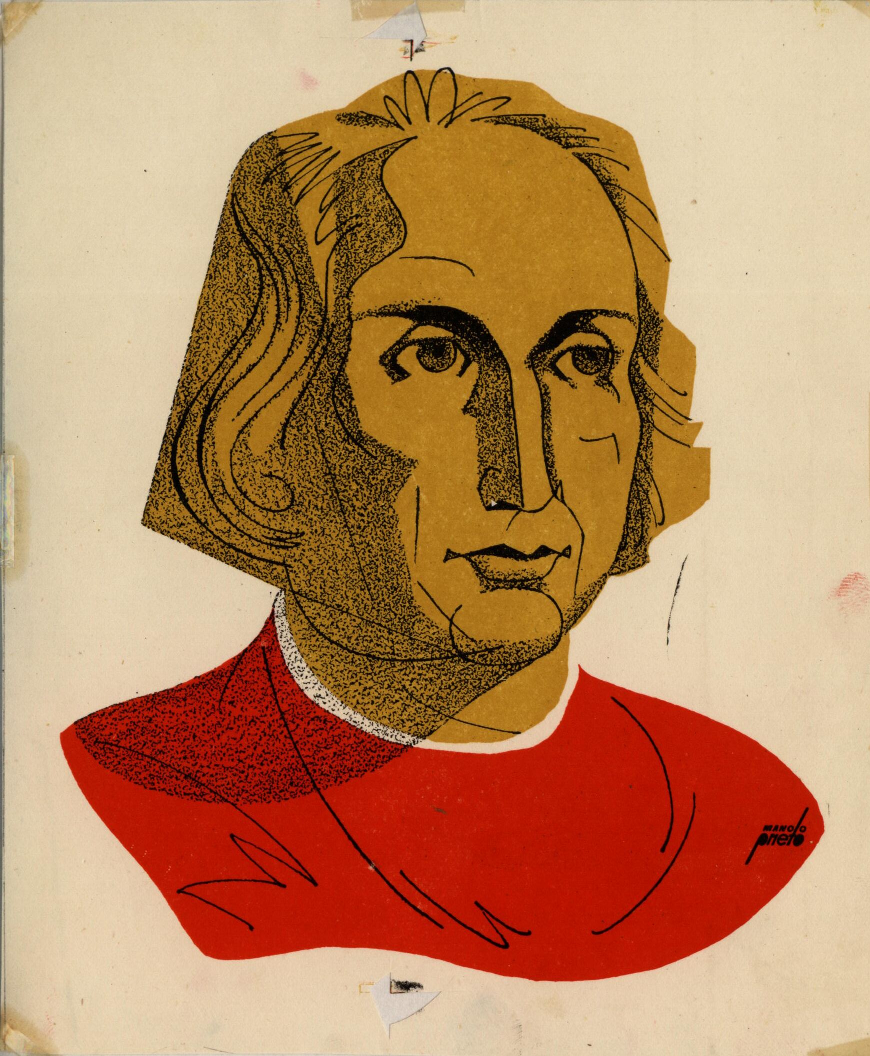 En este retrato firmado se representa el busto de un personaje masculino, muy probablemente Cristóbal Colón, de frente, con el tono de piel amarillento y en el que destaca una camiseta de color rojo. El pelo relativamente largo lo lleva suelto.Prueba de imprenta. Ilustración realizada para la revista semanal Novelas y Cuentos. Titulo: Autor: Nº publicado: Fecha: Tomo NC.